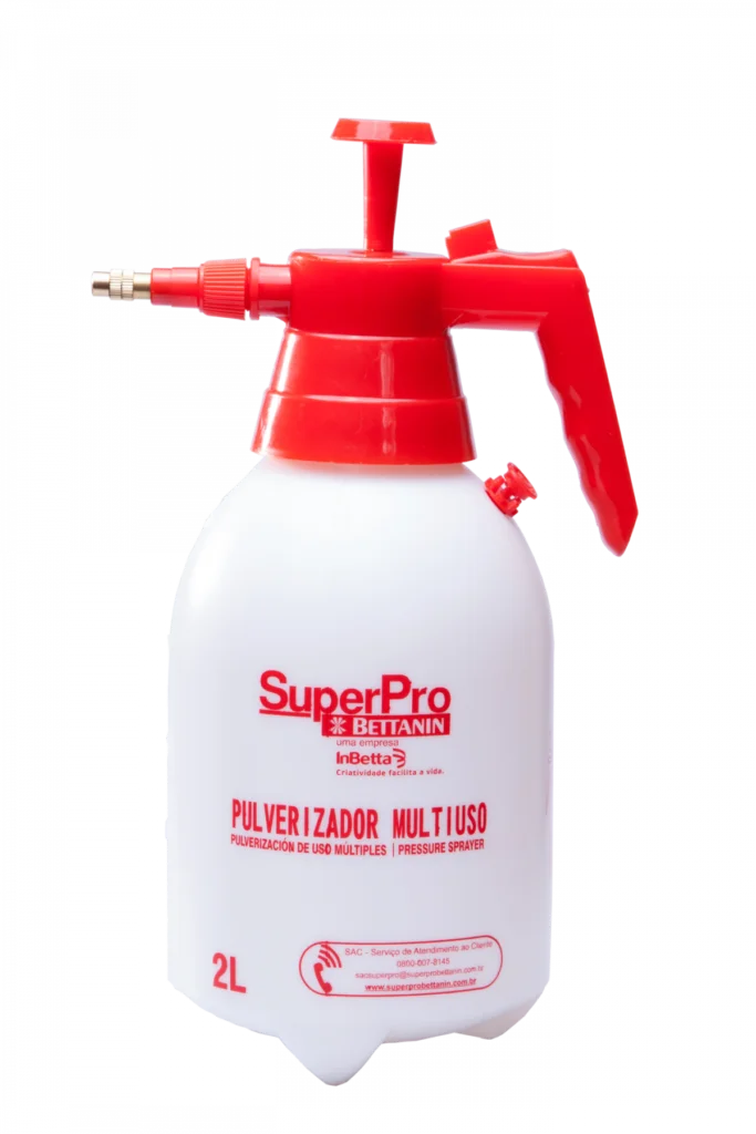 Pulverizador de plastico, com reservatorio na cor branca com capacidade para 2L de liquidos, com valvula pulverizadora de plastico na cor vermelha. Produto destina-se a pulverizacao de liquidos na jardinagem e para umedecer superficies a serem limpas.